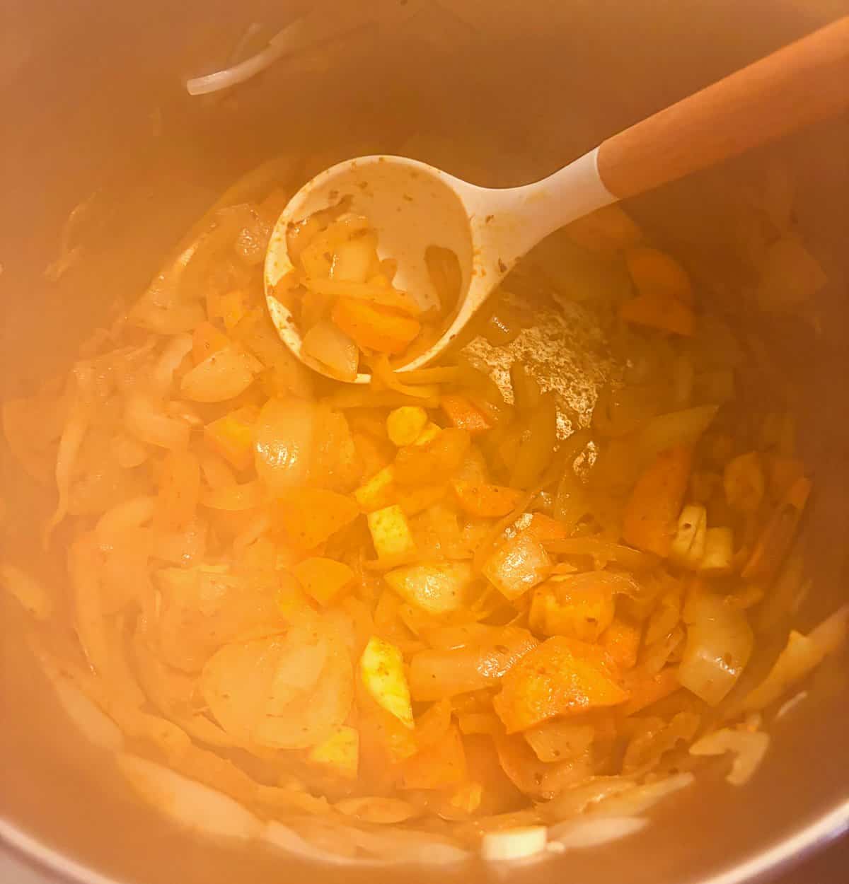- Build the base: Heat the olive oil in a large pot over medium heat. Add the onion, cook for abot 10 minutes until softened and starting to brown. The add the carrots and parsnip, and cook a few more minutes. Add the dried spices – cumin, Aleppo pepper and turmeric – cook for a few minutes until the spices become fragrant.