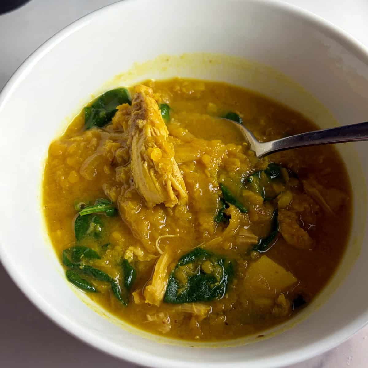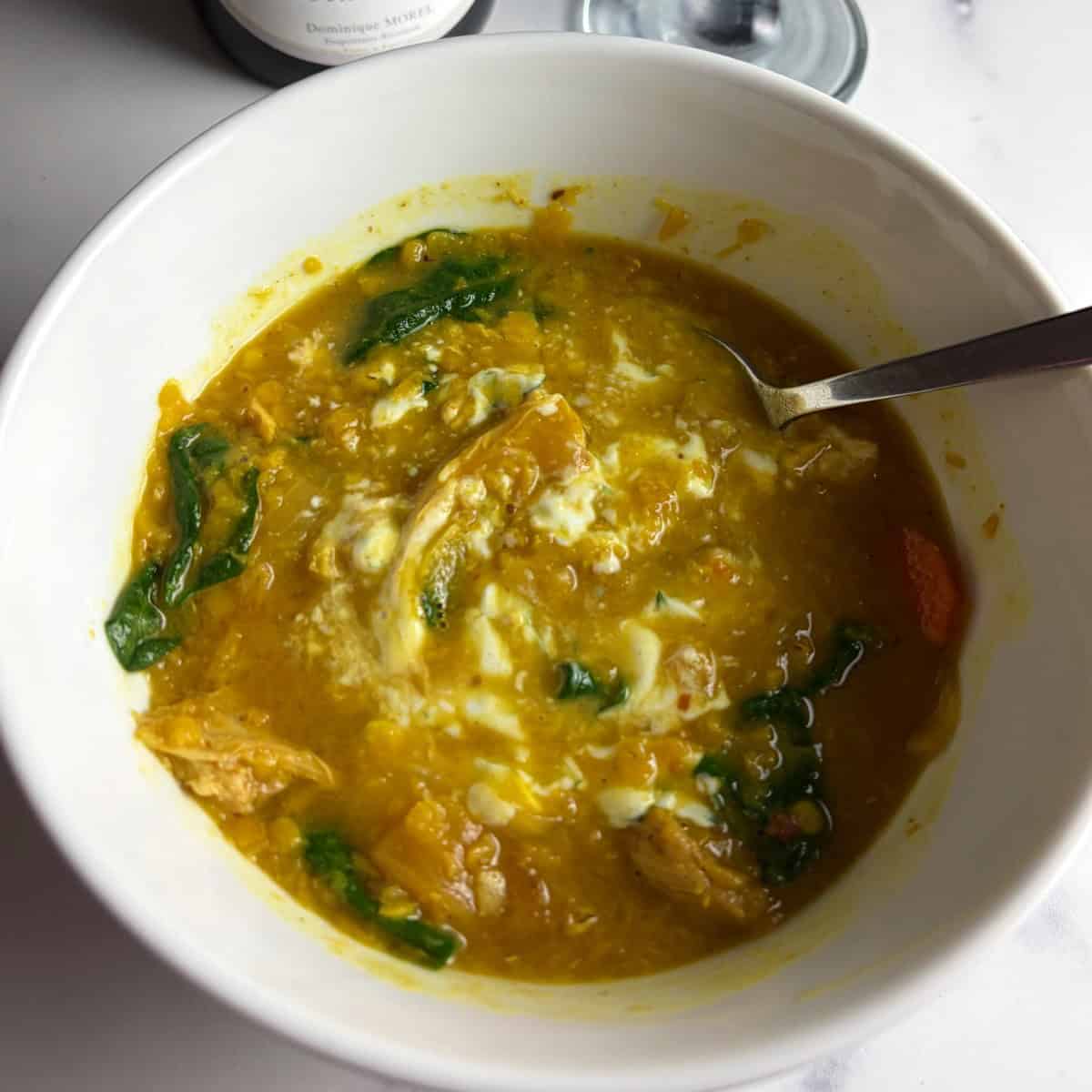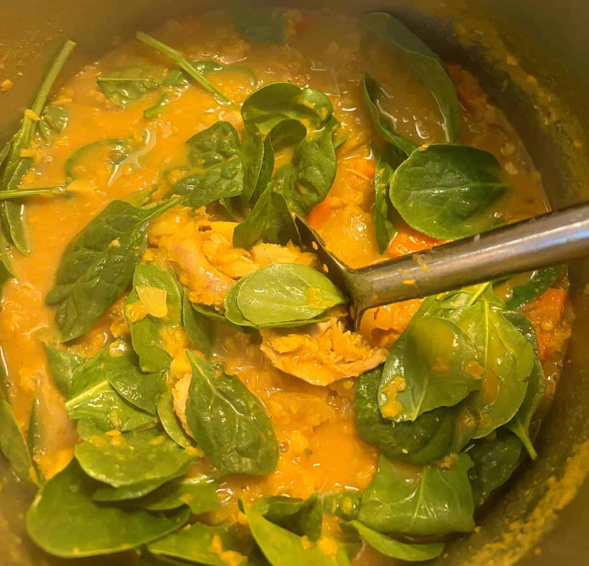 Let the soup simmer another 5 minutes so that the spinach wilts and the flavor combines. Now you are ready to enjoy the Hearty Chicken and Red Lentil with Spinach!
