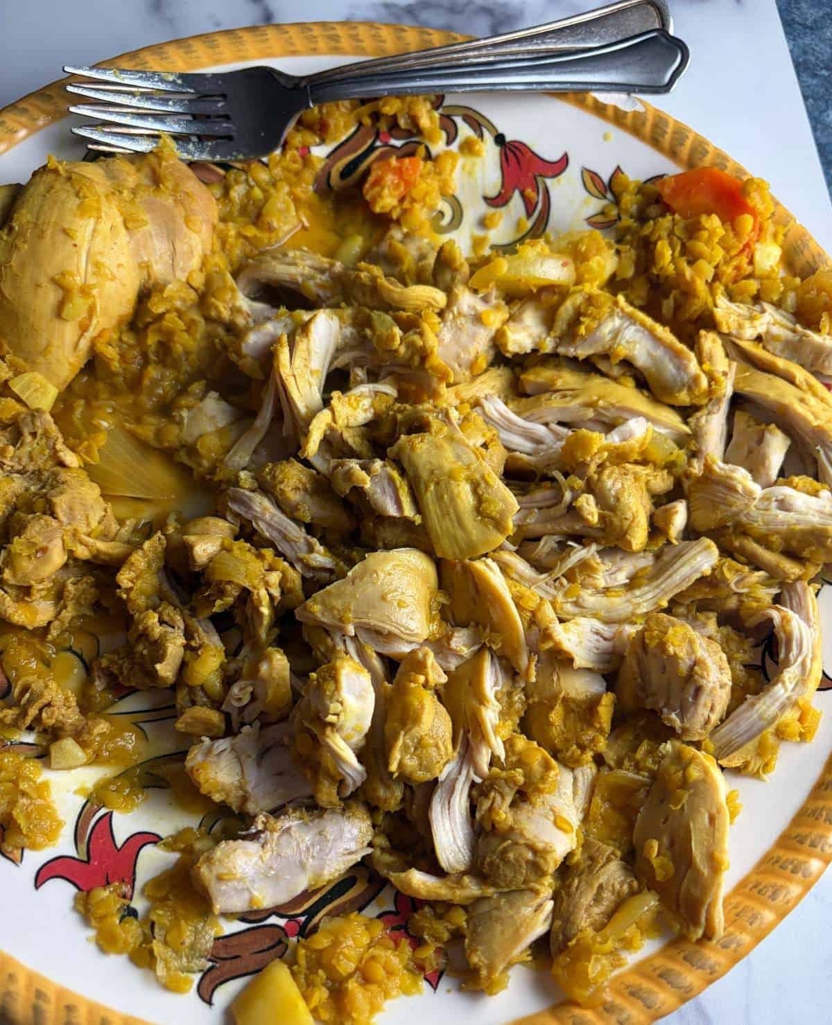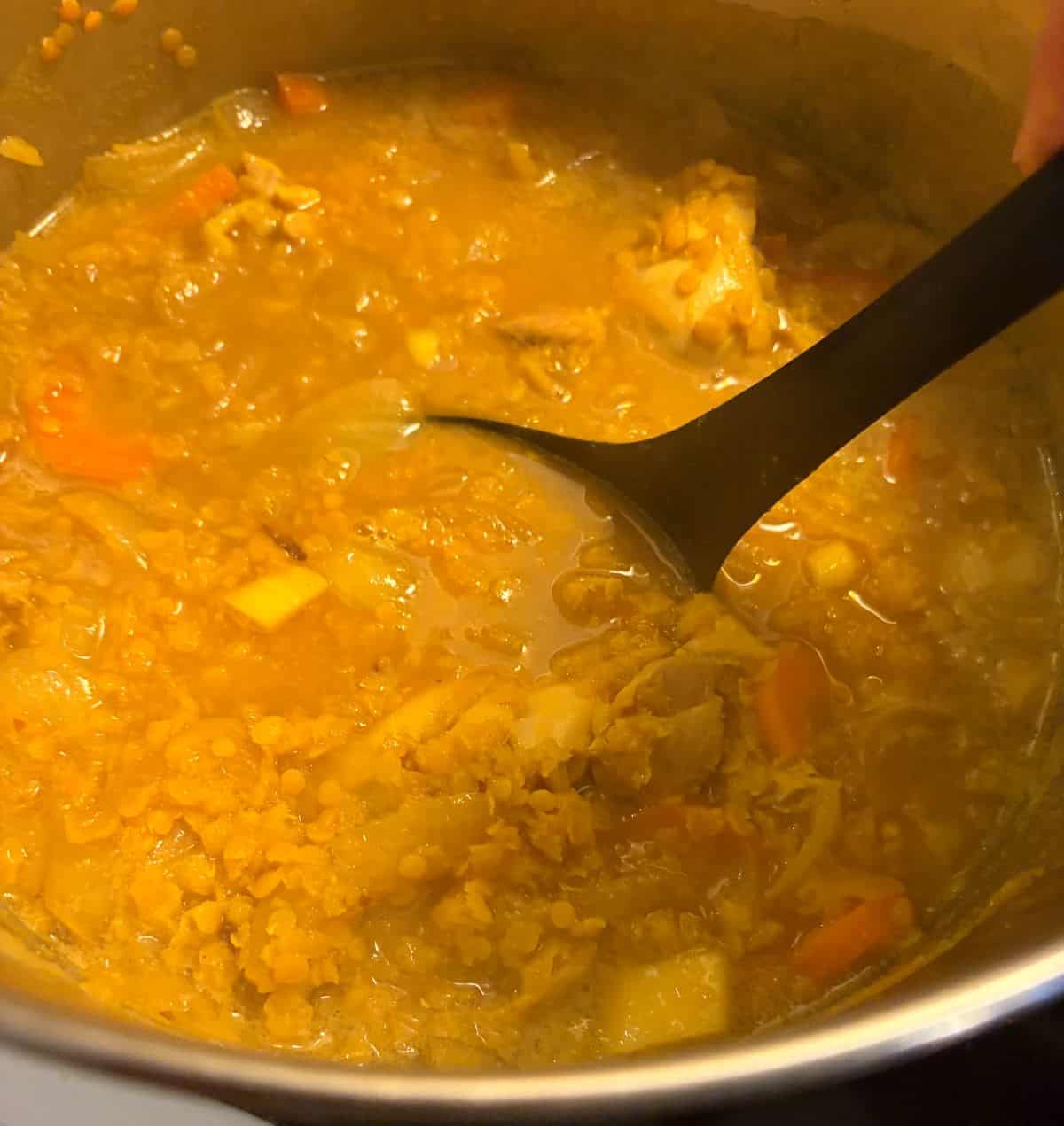 The soup simmers for about 30 minutes until the lentils have gotten very soft and the chicken is cooked through, as shown below.