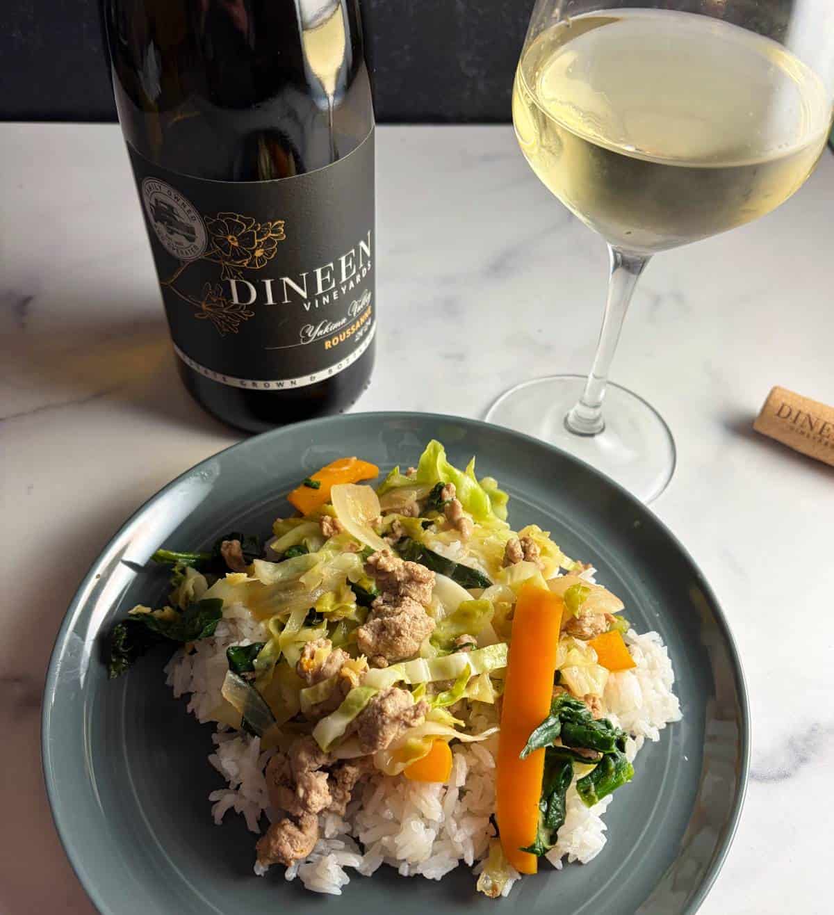 A versatile white with floral notes and a fuller texture, Dineen's Roussanne paired well with a ground turkey and cabbage stir-fry, complementing the savory flavors and subtle sweetness from the cabbage and miso.